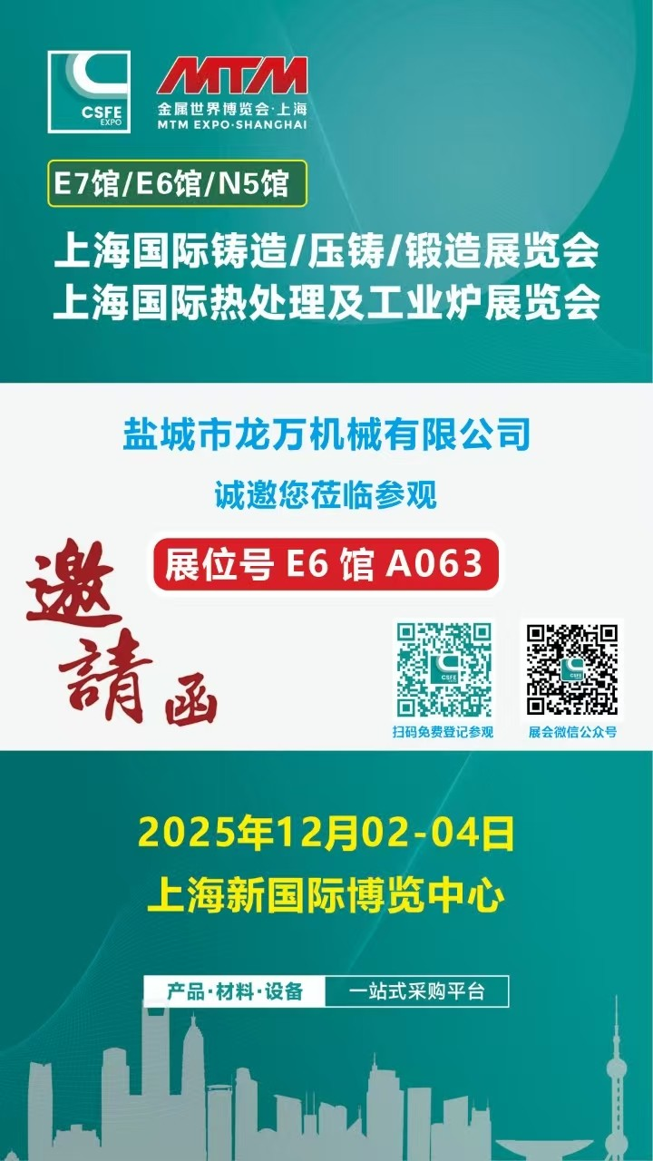 Yancheng Longwan Machinery Co., Ltd. vil delta i "Shanghai International Steel/Die Casting/Foundry Exhibition" og "Shanghai International Heat Treatment and Industrial Furnace Exhibition" som holdes på Shanghai International Expo Center fra 2. til 4. desember 2025. Denne utstillingen tiltrekker seg en rekke ledende selskaper fra stål- og støpeindustrien. Yancheng Longwan Machinery Co., Ltd. vil bruke denne plattformen til å vise frem sine nyeste teknologier og innovative produkter innen maskinproduksjon.
